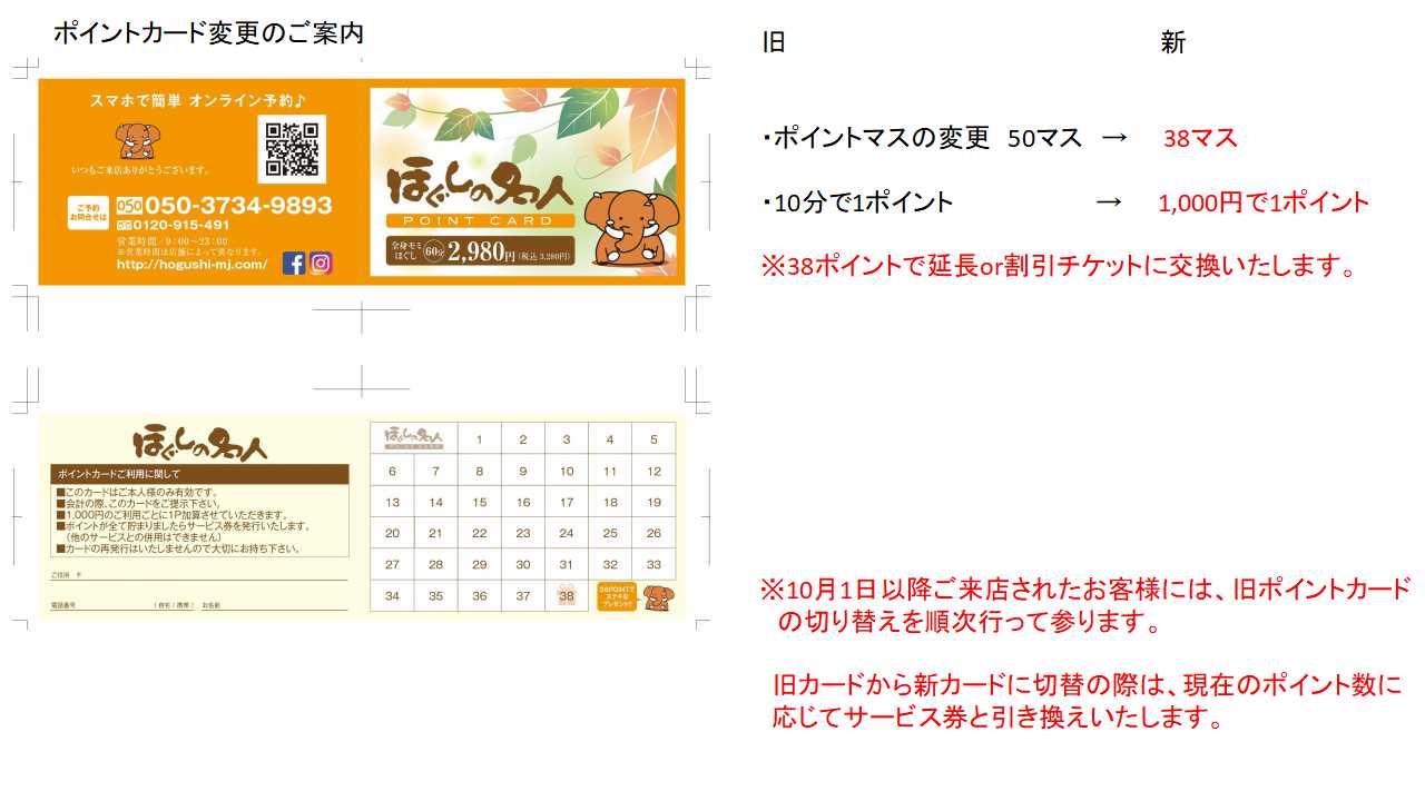 ほぐしの名人では、10月1日より、増税に伴いお客様へ発行しておりますポイントカードの取り扱いを以下のように変更致します。