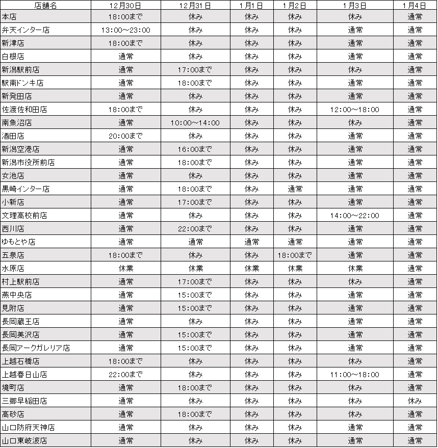 年末年始の休業期間について、各店の営業状況をお知らせ致します。