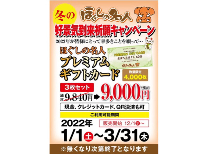ほぐしの名人では、年末恒例のプレミアムギフトカードを12月1日より店頭にて販売いたします。