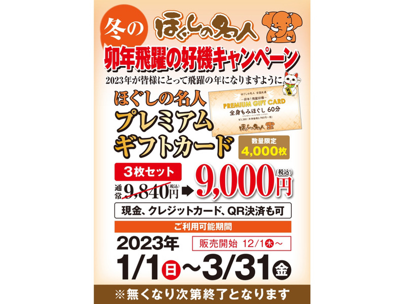 ほぐしの名人では、年末恒例のプレミアムギフトカードを店頭にて販売しております。