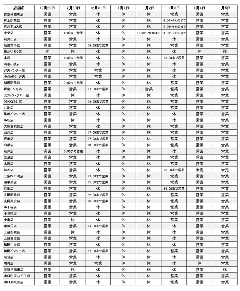 年末年始の休業期間について、各店の営業状況をお知らせ致します。